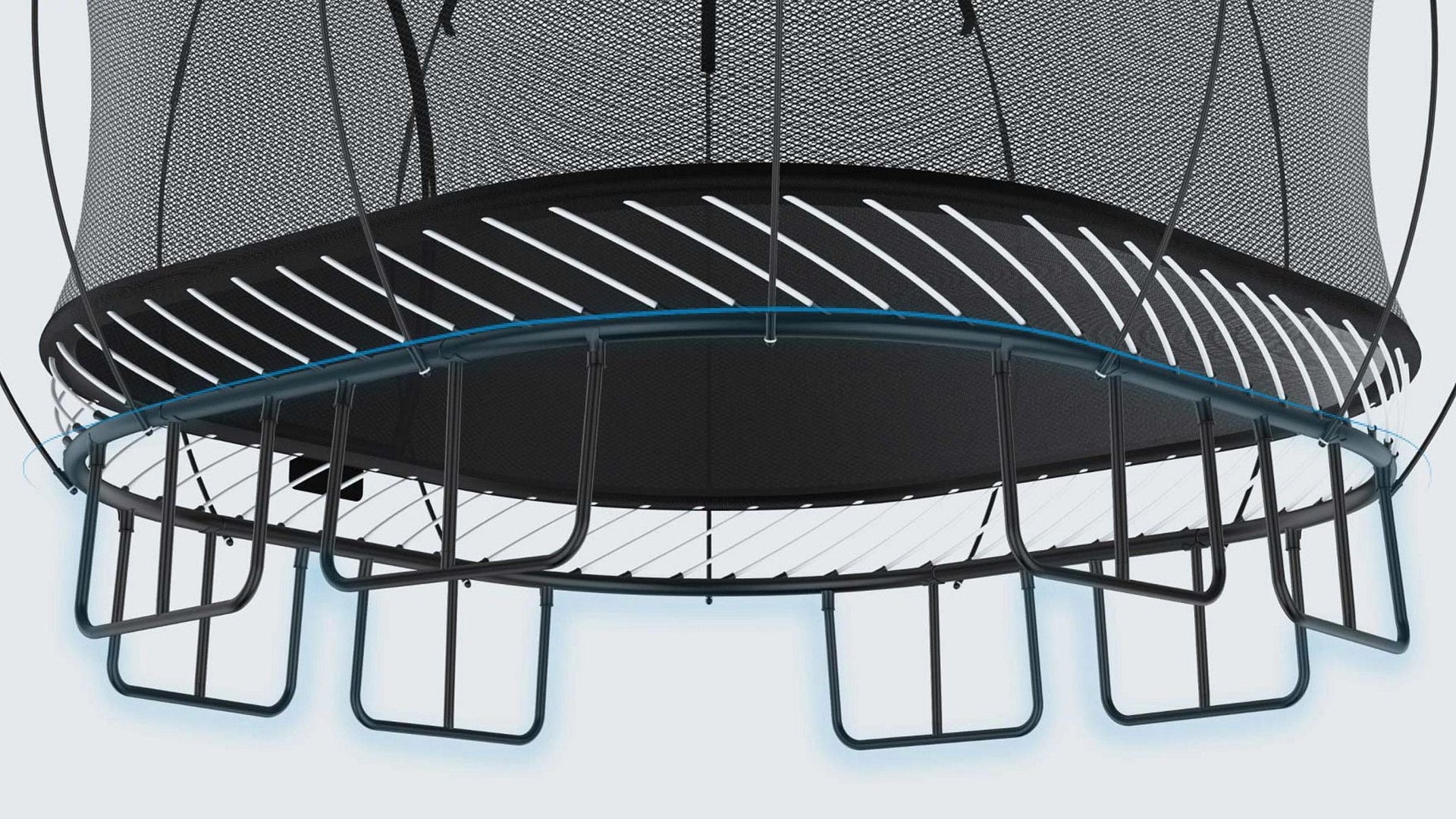 Der Trampolinrahmen aus verzinktem Stahl ist sicher unter der Sprungfläche positioniert. Er ist aus der Sicht des Springers „versteckt“ und eine Landung darauf ist unmöglich.